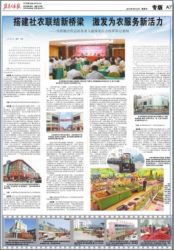 9月10日,《盐阜大众报》A7版以整版篇幅刊登题为《搭建社农联结新桥梁 激发为农服务新活力——市供销合作社负责人就深化综合改革答记者问》的长篇稿件,盐城市社党委书记、理事会主任施建霞结合实际,深度解读《决定》内容,并就如何贯彻落实《决定》精神,加快推进供销合作社综合改革、创新发展进行详细有力地阐述,在系统内外引起较好反响。